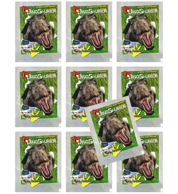 10 bustine per la collezione di figurine "Blue Ocean Dinosaurier". Ogni bustina contiene 5 adesivi.