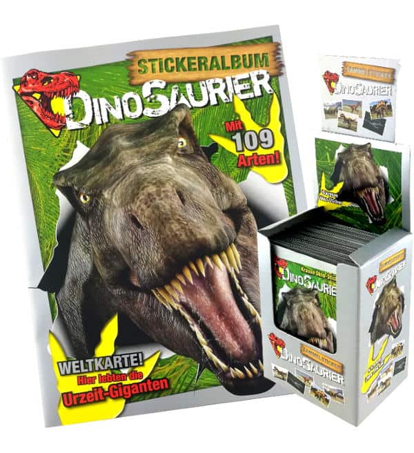Album (versione tedesca) + scatola da 50 bustine per la collezione di figurine "Blue Ocean Dinosaurier". Ogni bustina contiene 5 adesivi.