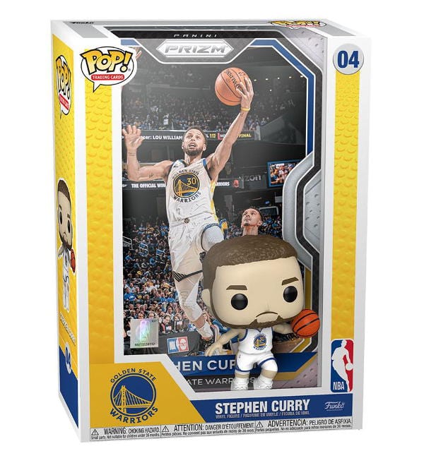 Funko POP! "Trading Cards 04 NBA - Steven Curry Golden State Warriors" come Trading Card POP!. La figura in vinile è alta circa 9 cm e viene fornita in una scatola con finestra con una Panini Prizm Card stilizzata come sfondo.