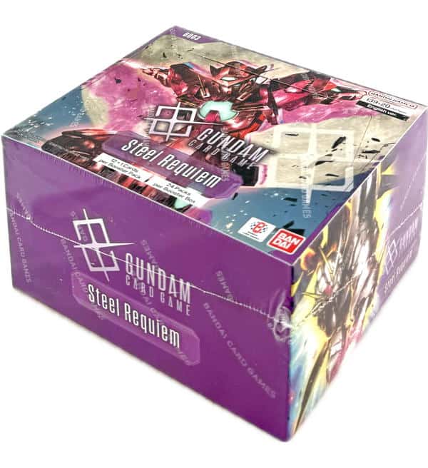 Scatola da 24 bustine della collezione "Gundam Card Game - Steel Requiem GD-03". Ogni bustina contiene 12 + 1 card.