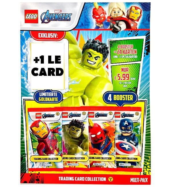 Lego Avengers Serie 1 Multipack con 4 bustine (=24 cards) + 1 Limited Card. Ogni Multipack contiene una delle 4 Limited Cards seguenti: