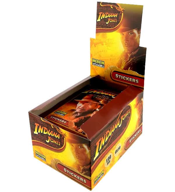 Scatola da 50 bustine per la collezione di figurine "Merlin Indiana Jones". Ogni bustina contiene 5 adesivi.