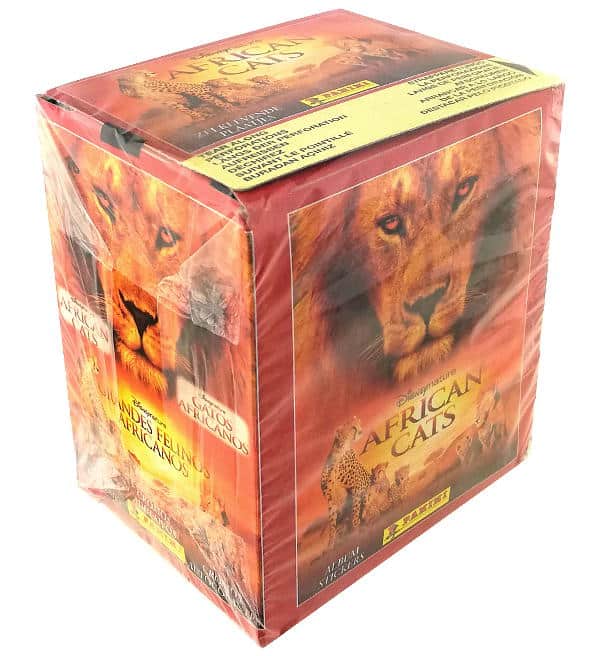 Scatola da 50 bustine per la collezione di figurine "Panini African Cats". Ogni bustina contiene 5 adesivi.