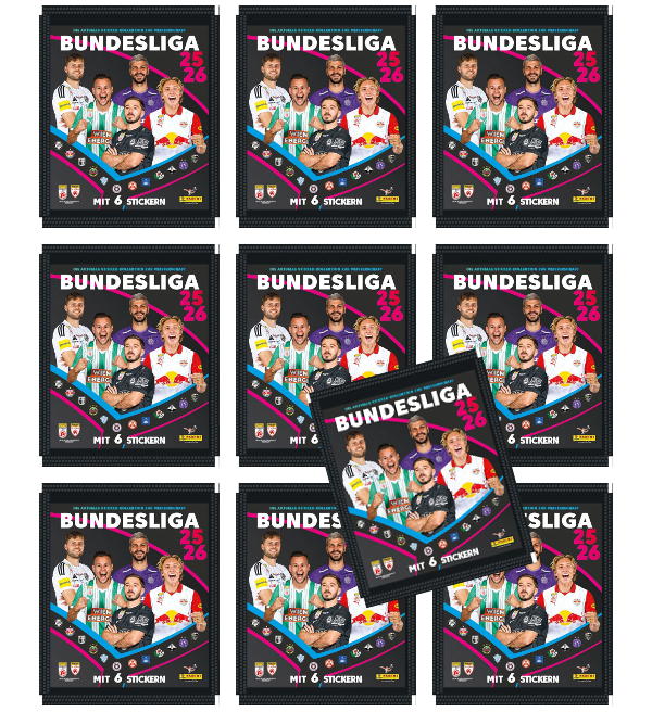 10 bustine per la collezione di figurine "Panini Bundesliga Austria 2025-26". Ogni bustina contiene 6 sticker.