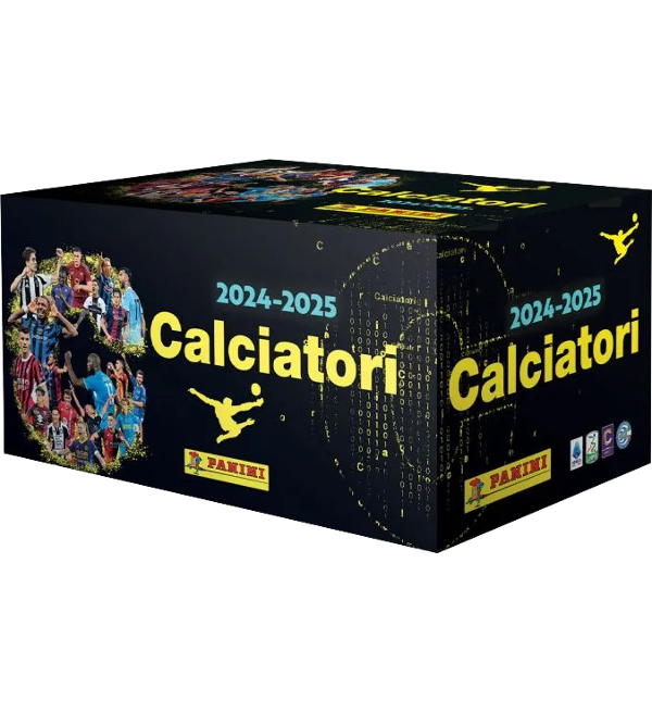 Scatola da 100 bustine della collezione di figurine "Panini Calciatori 2024-2025 Serie A". Ogni bustina contiene 6 adesivi + 1 figurina "Fuori Raccolta".