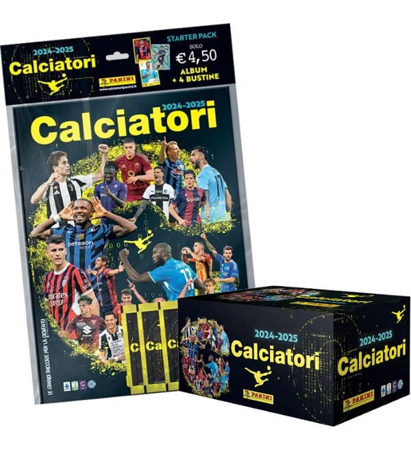 Starter Pack + scatola da 100 bustine della collezione di figurine "Panini Calciatori 2024-2025 Serie A". Ogni bustina contiene 6 adesivi + 1 figurina "Fuori Raccolta".