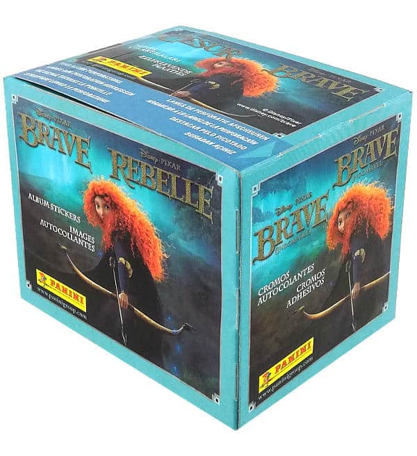 Scatola da 50 bustine per la collezione di figurine "Panini Disney Brave". Ogni bustina contiene 5 adesivi.