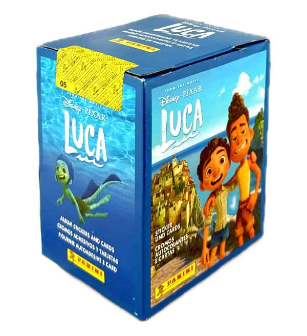 Scatola da 50 bustine per la collezione di figurine Panini Disney Luca Movie. Ogni bustina contiene 5 adesivi.
