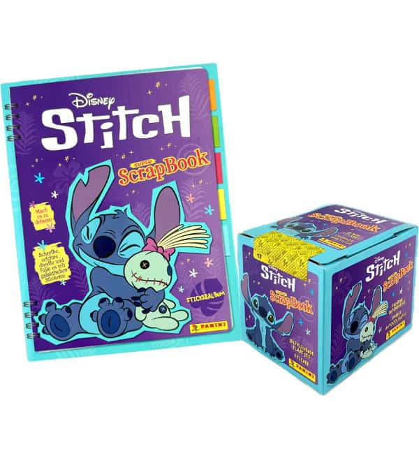 Album tedesco + scatola da 36 bustine per la collezione di figurine Panini Disney Stitch - Super ScrapBook (2025). Ogni bustina contiene 5 adesivi.