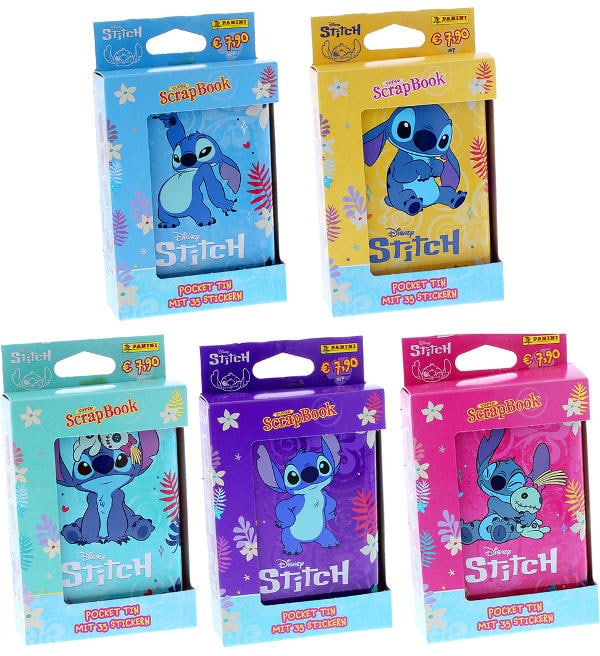 Pocket Tin Set (=5 Tins) della collezione di figurine Panini Disney Stitch - Super ScrapBook. Ogni tin contiene 35 sticker.