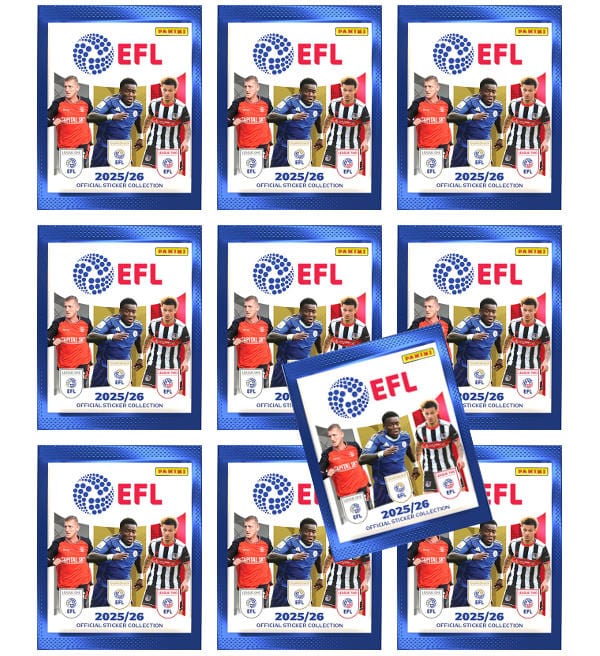 10 bustine per la collezione di figurine "Panini EFL 2025-26". Ogni bustina contiene 5 sticker.