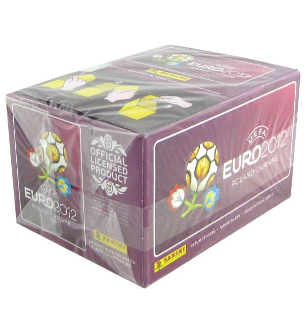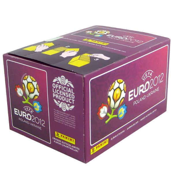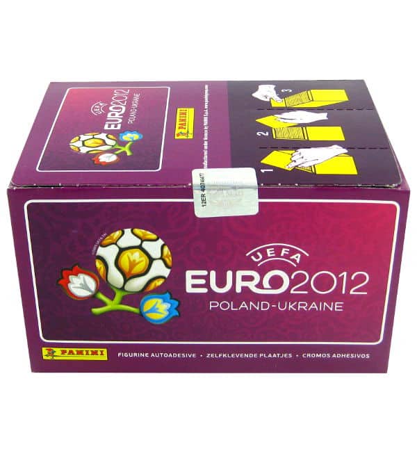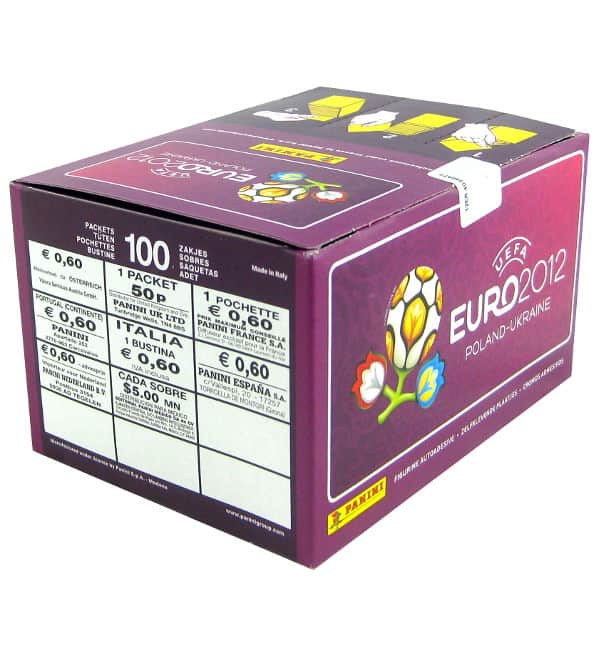 Scatola viola da 100 bustine (=500 figurine) della collezione Panini Euro 2012. Questa è la versione internazionale. Ciò significa che gli adesivi hanno una cornice bianca.