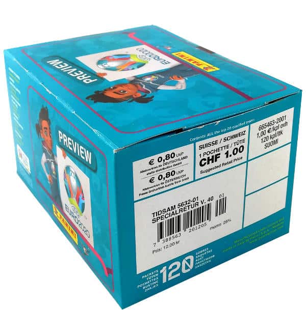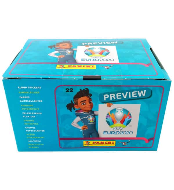 Scatola da 120 bustine della collezione figurine Panini EURO 2020 Preview. Ogni bustina contiene 5 adesivi. La box contiene in totale 600 figurine Panini EURO 2020 Preview.