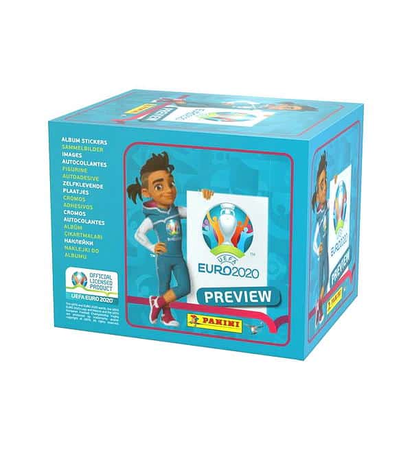 Scatola da 60 bustine della collezione figurine Panini EURO 2020 Preview. Ogni bustina contiene 5 adesivi. La box contiene in totale 300 figurine Panini EURO 2020 Preview.
