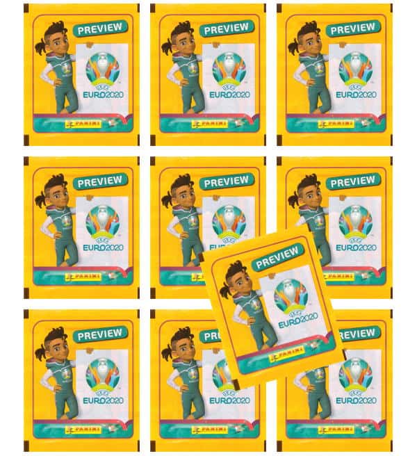 10 bustine (versione internazionale) della collezione figurine Panini EURO 2020 Preview. Ogni bustina contiene 5 figurine.