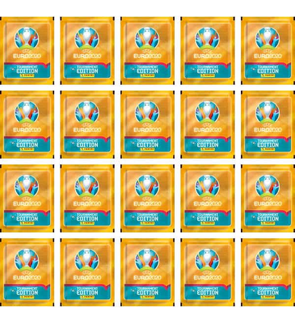 20 bustine (=100 figurine) della collezione figurine Panini EURO 2020 Tournament Edition. Ogni bustina contiene 5 adesivi.