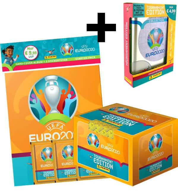 1 Hardcover Starter Pack con 3 bustine + 1 scatola da 100 bustine + 1 Tin Box da 5 bustine della collezione figurine Panini EURO 2020 Tournament Edition.