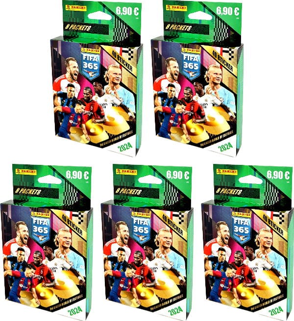5 Blisters da un totale di 40 bustine (=200 figurine) per la collezione di figurine Panini FIFA 365 2024.
