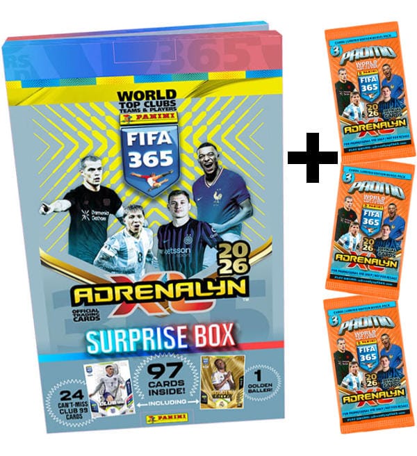 Calendario dell'avvento (Surprise Box) + 3 Limited Edition Bonus Packs della collezione "Panini FIFA 365 2026 Adrenalyn XL" Trading Cards con: