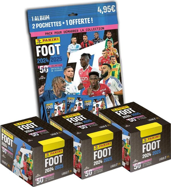 Starter Pack + 3 scatole (=150 bustine) per la collezione di figurine "Panini Foot 2025 Ligue 1". Ogni bustina contiene 7 adesivi.