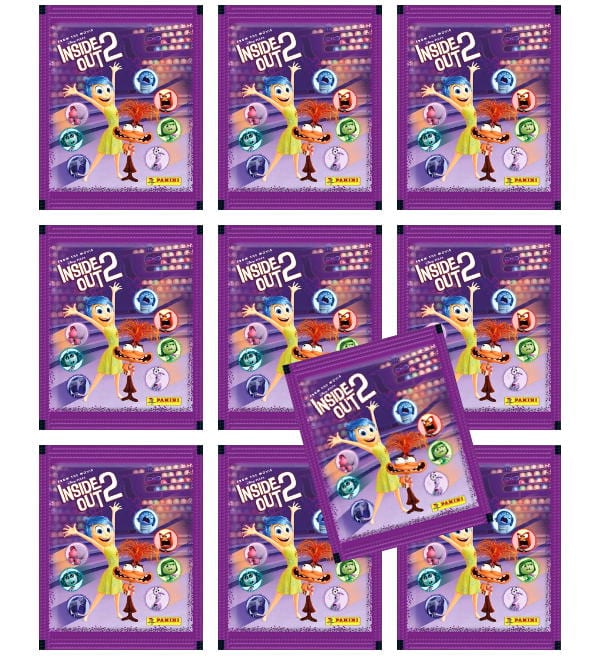 10 bustine per la collezione di figurine Panini Inside Out 2. Ogni bustina contiene 5 adesivi.