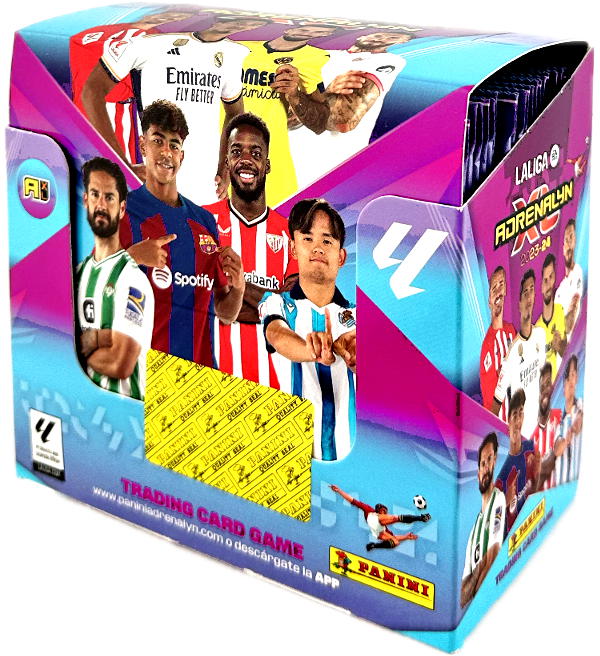 Scatola da 50 bustine della collezione "Panini LaLiga Adrenalyn XL 2023-24" Trading Cards. Ogni bustina contiene 6 cards. La box contiene in totale 300 cards.