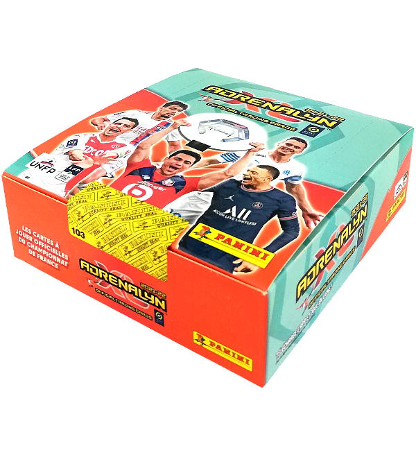 Scatola da 18 bustine della collezione "Panini Ligue 1 Adrenalyn XL 2021-22" Trading Cards. Ogni bustina contiene 8 cards. La box contiene in totale 144 Panini FIFA 365 2020 Adrenalyn XL cards. La scatola è sigillata originale.