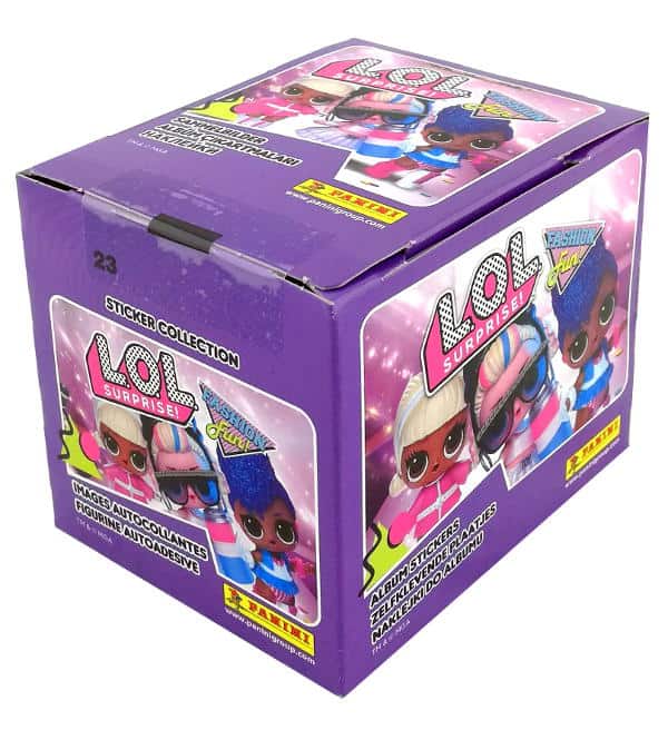 Scatola da 50 bustine per la collezione di figurine Panini LOL Surprise "Fashion Fun". Ogni bustina contiene 5 adesivi.
