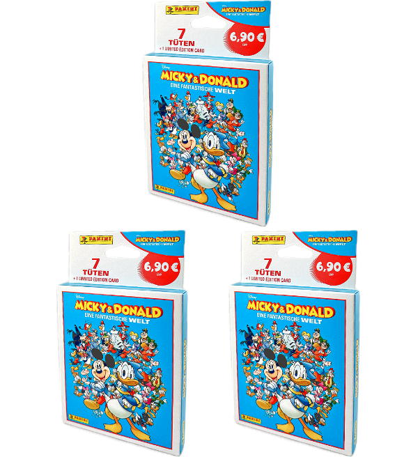 3 x Eco-Blister (=21 bustine + 3 Limited Edition Cards) per la collezione di figurine & cards "Panini Mickey & Donald". Ogni bustina contiene 4 adesivi + 1 Trading Card.