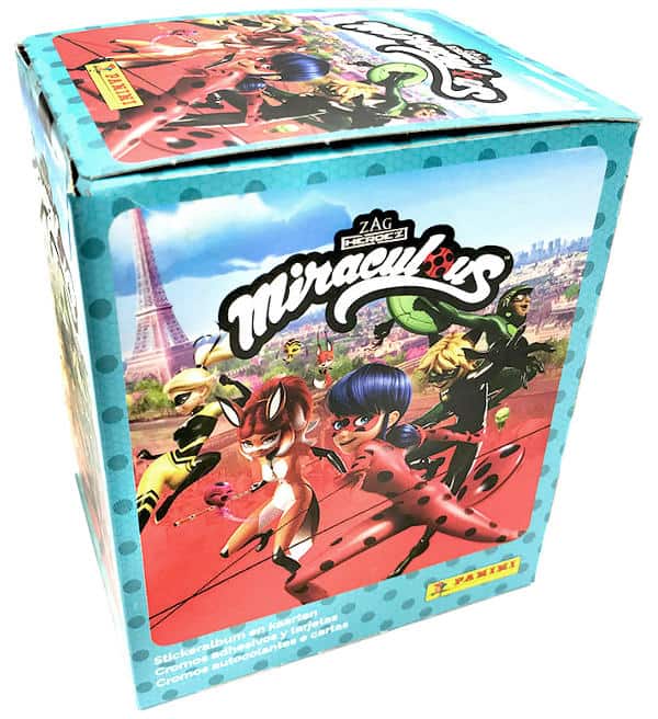 Scatola da 50 bustine per la collezione ufficiale di figurine e carte Panini Miraculous. Ogni bustina contiene 4 adesivi + 1 card