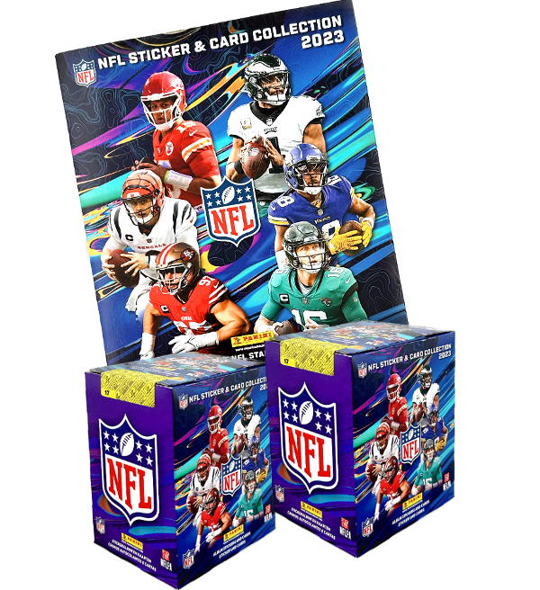 Album + 2 Scatole (=100 bustine) per la collezione di figurine & cards "Panini NFL 2023". Ogni bustina contiene 5 adesivi + 1 Trading Card.