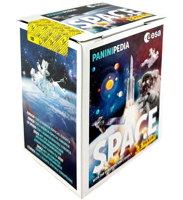 Scatola da 36 bustine per la collezione di figurine "Panini Paninipedia Lo Spazio". Ogni bustina contiene 5 adesivi.