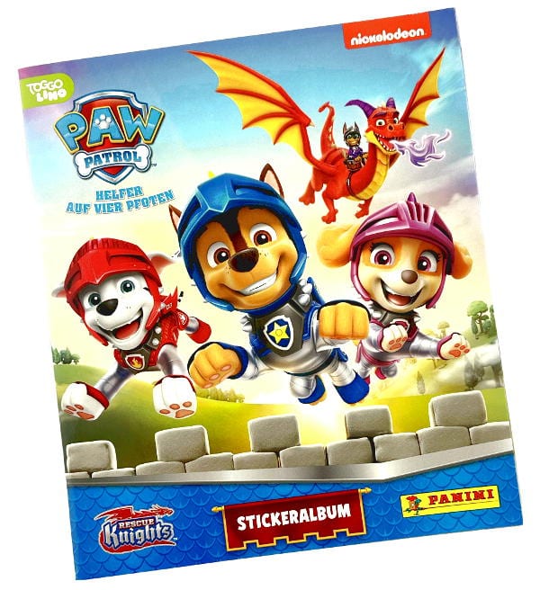 Album vuoto (versione tedesca) per la collezione figurine "Panini Paw Patrol - Rescue Knights" con 6 adesivi gratuiti. L'album ha 32 pagine e può essere incollato da 149 adesivi.