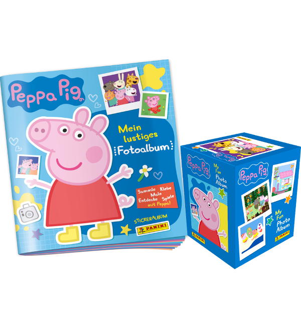 Album (versione tedesca) + scatola da 36 bustine per la collezione di figurine e carte "Panini Peppa Pig - My Fun Photo Album". Ogni bustina contiene 4 adesivi + 1 card