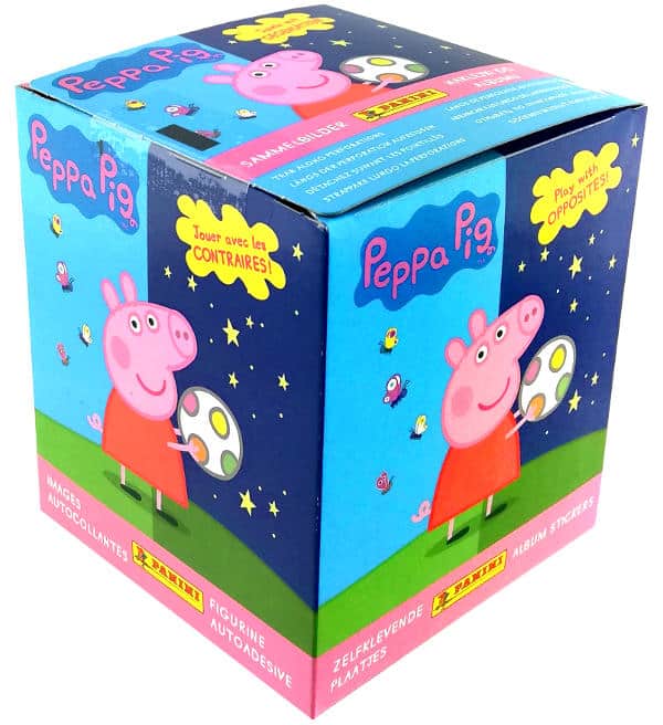 Scatola da 36 bustine per la collezione di figurine e carte "Panini Peppa Pig Spiele mit Gegensätzen". Ogni bustina contiene 4 adesivi + 1 card