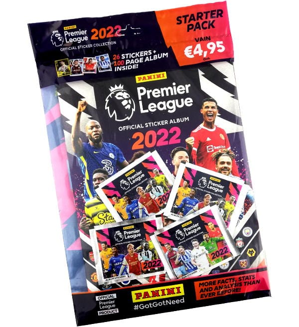 Starter Pack con 1 album + 4 bustine per la collezione di figurine "Panini Premier League 2022". Ogni bustina contiene 5 adesivi.