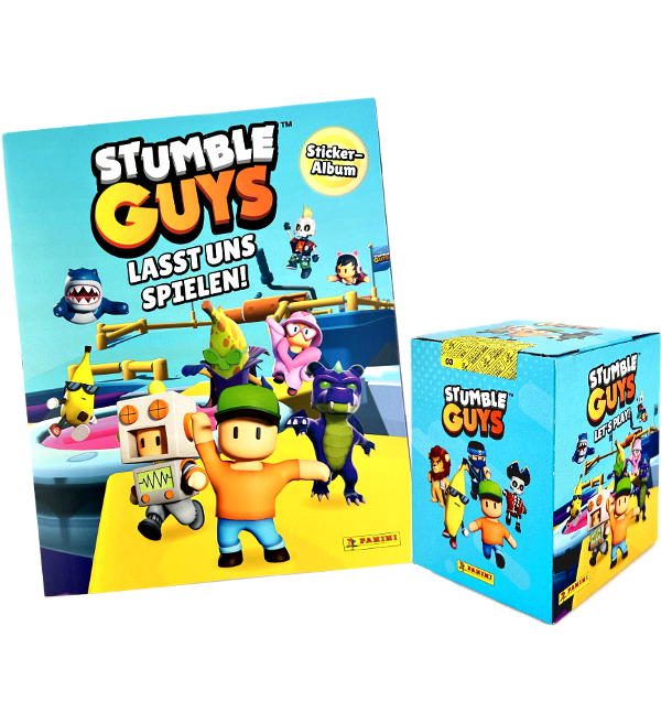 Album (versione tedesca) + scatola da 36 bustine per la collezione di figurine "Panini Stumble Guys Let's Play". Ogni bustina contiene 5 adesivi.