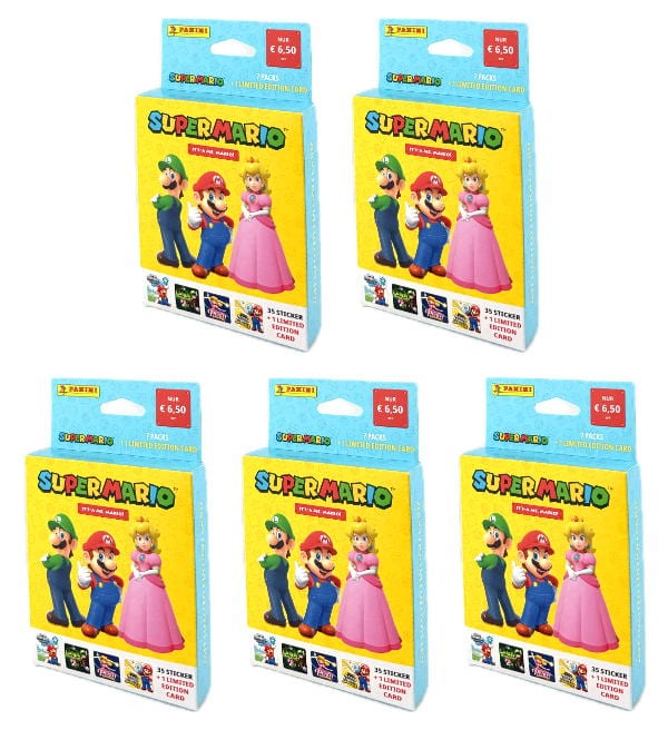 5 x Eco-Blister con un totale di 35 bustine + 5 Limited Edition Cards per la collezione di figurine Panini Super Mario - It's-a Me Mario (2025). Ogni bustina contiene 5 adesivi.