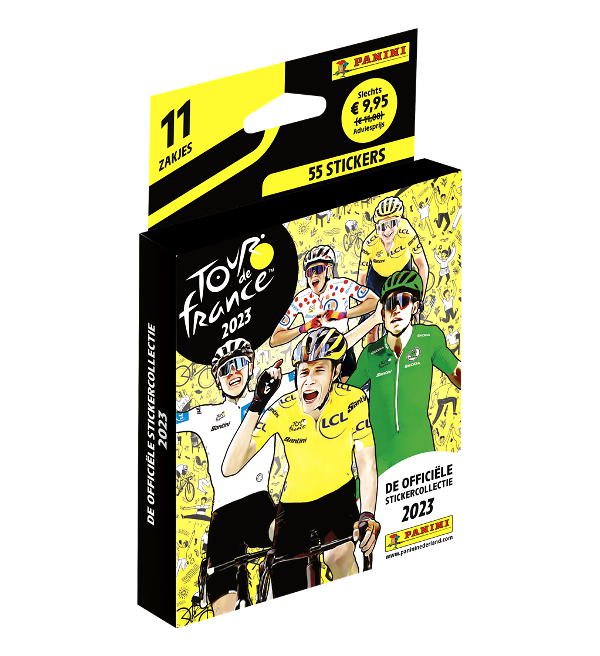Eco-Blister da 11 bustine per la collezione di figurine "Panini Tour de France 2023". Ogni bustina contiene 5 adesivi.