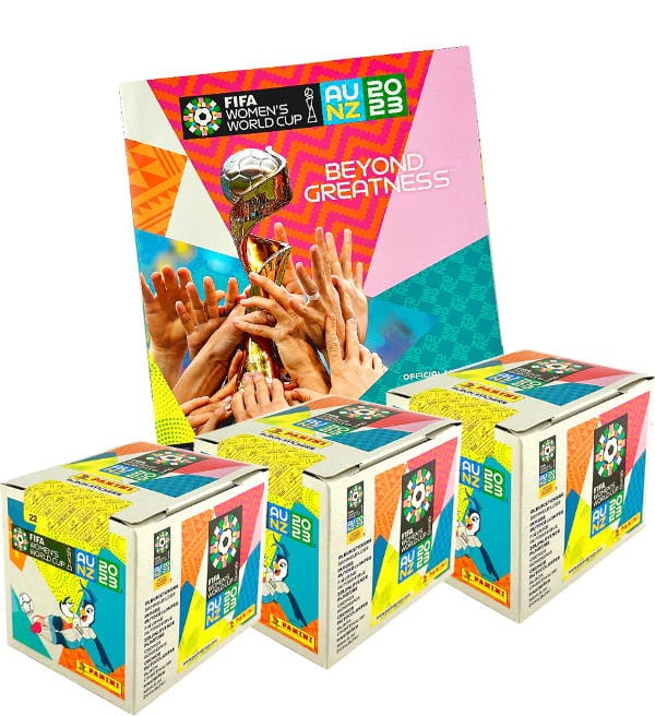 Album + 3 scatole (=108 bustine) per la collezione di figurine "Panini Womens World Cup 2023". Ogni bustina contiene 5 adesivi.