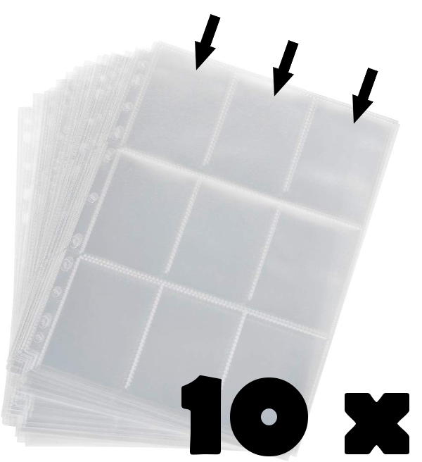 10 "9-Pocket Pages Top Loading" di alta qualità con 11 fori per riporre in sicurezza le tue carte collezionabili. Le "9-Pocket Pages" sono adatte a tutte le carte standard come Pokémon, Yu-Gi-Oh, Magic ecc.