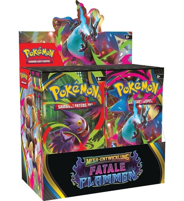 Scatola da 36 bustine (=360 cards) originale sigillata del set di estensione "Mega-Entwicklung 02 - Fatale Flammen". Ogni bustina contiene 10 cards.
