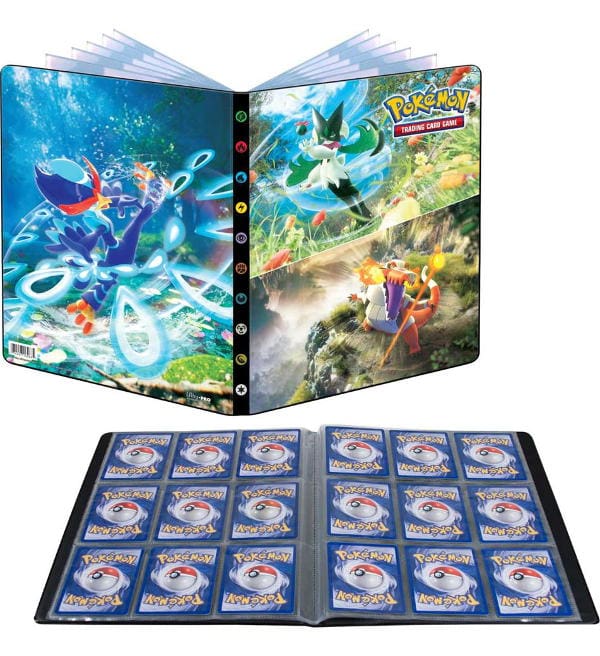 Raccoglitore Pokemon A4 di Ultra Pro per il set di estensione "Scarlatto e Violetto 02 - Paldea Evolved" con 14 pagine per 9 carte ciascuna. Il portafoglio offre spazio per 126 carte con allocazione unilaterale o 252 carte con allocazione fronte / retro.
