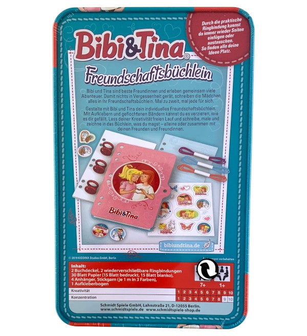 Bibi & Tina libretto dell'amicizia con adesivi e nastri intrecciati, puoi progettare il libretto dell'amicizia insieme ai tuoi amici come ti piace. Sii creativo e disegna, scrivi e dipingi ciò che ti piace nel libretto, da solo o insieme ai tuoi amici.
