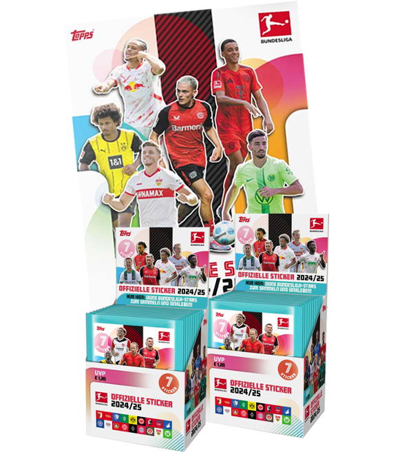 Album + 2 scatole (=100 bustine) per la collezione di figurine Topps Bundesliga 2024/2025. Ogni bustina contiene 7 adesivi.