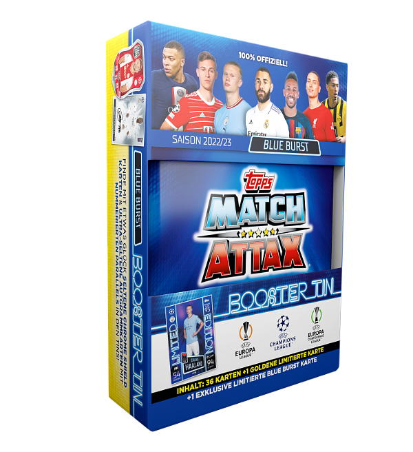Booster Tin "Blue Burst" della collezione Topps Champions League Match Attax 2022/23 Trading Cards. Ogni Mini Tin contiene 36 carte + 1 Limited Edition Gold Card + 1 NEON BOOSTER Limited Edition Card.