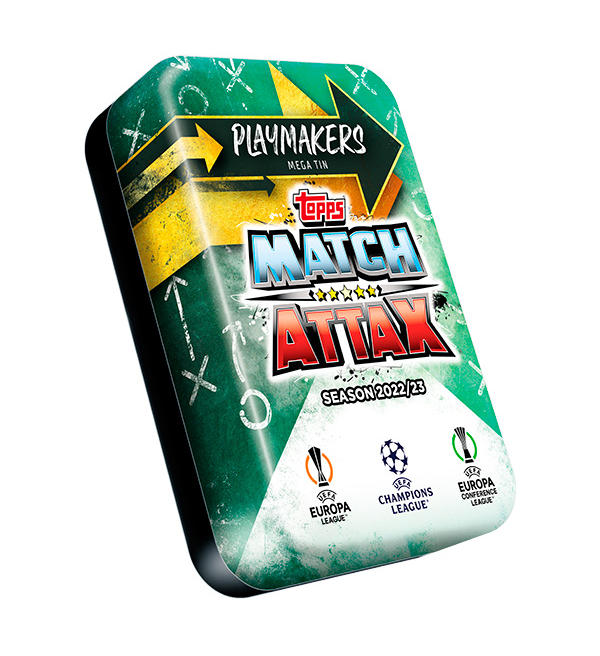 Mega Tin PLAYMAKERS della collezione Topps Champions League Match Attax 2022/23 Trading Cards. Ogni Mega Tin contiene 66 carte + 4 exclusive Master Limited Edition cards: