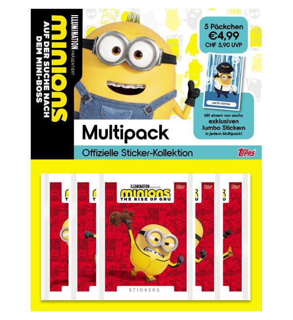Multipack V2 da 5 bustine + 1 Jumbo Sticker per la collezione di figurine Topps Minions - The Rise of Gru 2022. Ogni bustina contiene 6 adesivi.