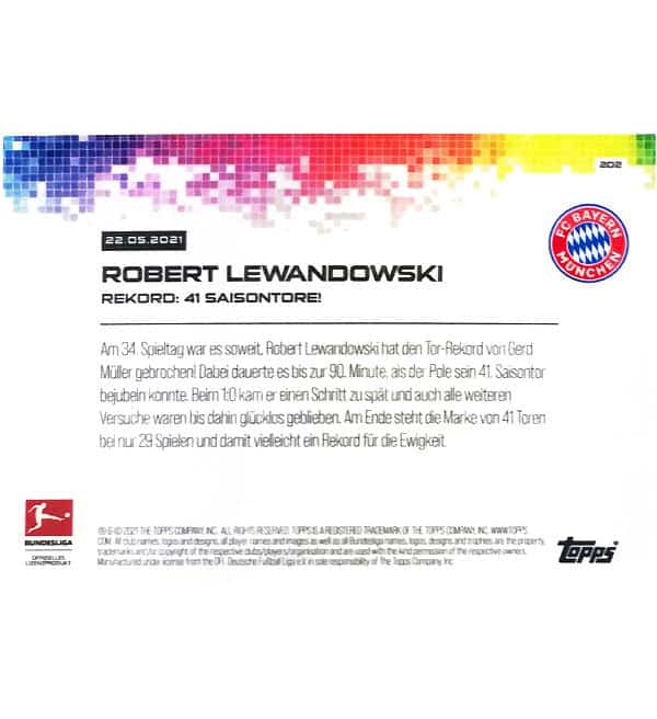Red Parallel #45/99 della carta Topps NOW #202 per il record di 41 gol di Robert Lewandowski (FC Bayern Monaco) nella stagione di Bundesliga 2020/21. La card è stampata su 16pt "Glossy Trading Card Stock".