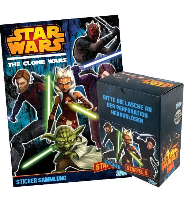 Album vuoto (versione tedesca) + scatola da 50 bustine per la collezione di figurine "Topps Star Wars Clone Wars S05". Ogni bustina contiene 5 adesivi.